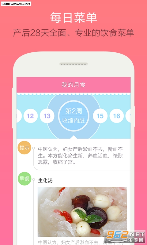 针对产妇坐月子期间每个阶段不同的饮食需求,准备了月子期间每一天所需的菜单列表;还系统、全面地提供了包括文字、图片、视频、营养提示等在内的,最详尽、最周到、最个性化的月子食谱,力求满足产妇月子期间全部的食补需求。