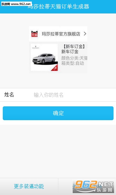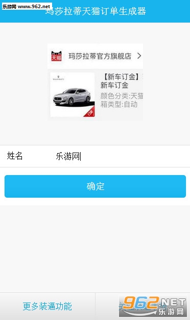 玛莎拉蒂这款名车相信很多人都有所耳闻吧,现在天猫正式开启了玛莎拉蒂的预定,对于买不起的朋友来说,咱使用玛莎拉蒂天猫订单生成器装装逼也是可以的,到时候发到朋友圈让众多好友惊呆吧!
