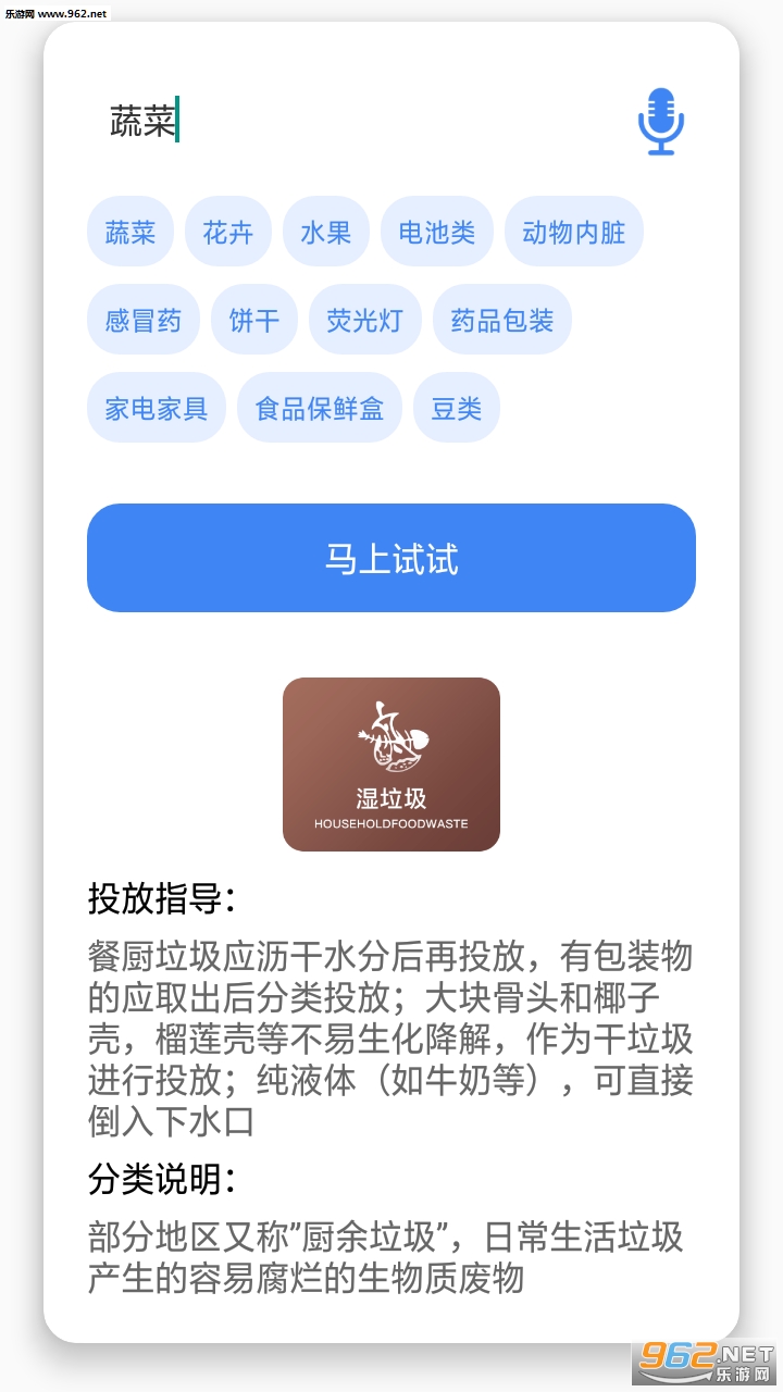 1、照识别、语音识别、输入查询垃圾、帮你快速查询你想知道垃圾的分类。