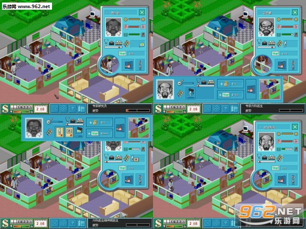 这个游戏一开始会给你50000元和一块地皮,有些关还会配给你几个医生。最后要求达到一定的声望,医院价值及存款,还有治愈数。一关比一关要求高,而且每关会让你建几种房间,每关还会遇到不同的问题。是个设计出色的模拟经营游戏。