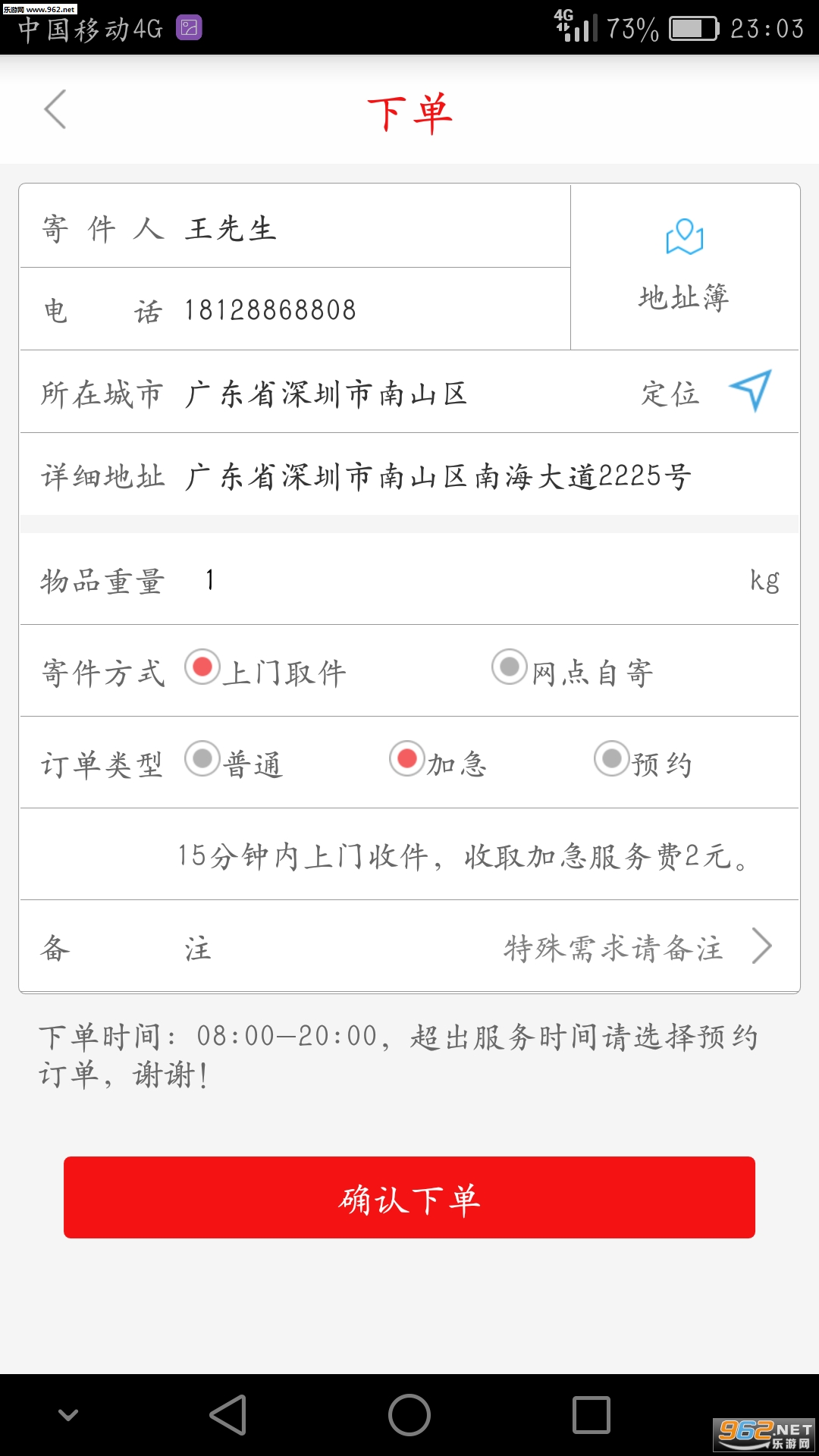下单:默认地址、一键下单,提供加急、预约订单服务。