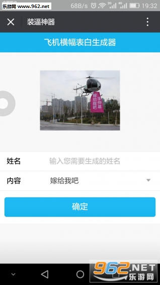 《直升机表白图片生成器》是一款为小伙伴们打造的装B神器,小伙伴们只需按照下面的方法写上名字和要说的话就可以自动生成飞机横幅表白图片了,行动起来装B开始。