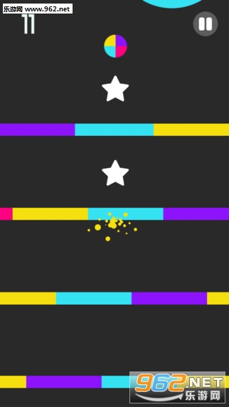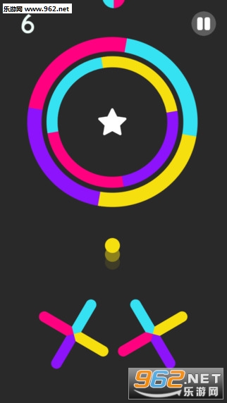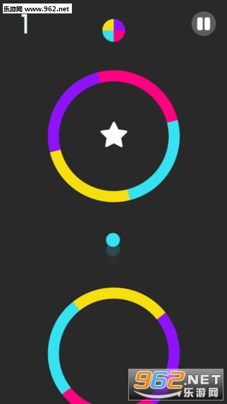 该作的玩法十分简单,玩家只需要点击控制小球上升的速度和高度,通过与障碍中与小球颜色相同的部分即可。不过在其中的障碍是时刻运转的,这些障碍由不同的颜色组成,若小球碰撞到与球体颜色不同的障碍,那么小球就会瞬间碎裂,游戏就Game Over了。小球每次迟到道具都会随机转换一种颜色。整个游戏中只存在四种颜色,蓝色、红色、紫色和黄色,而小球和障碍就在这四种基色当中不断的变换。