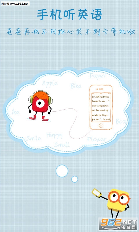 3、学英文:上学了,开课了,英文听说很重要。学校里,发磁带,爸妈还要买机器。哈炫派,帮你忙,手机就能听英文。点一点,手机放,再也不用听磁带。