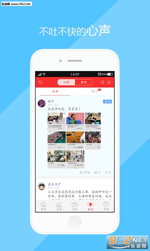 心事app是一款心事诉说社区,能看到各种匿名用户在线吐槽,查看用户的狗血事迹,有些不能和他人说的事和话,你都能在心事app里匿名发表,让陌生人给你参考意见。