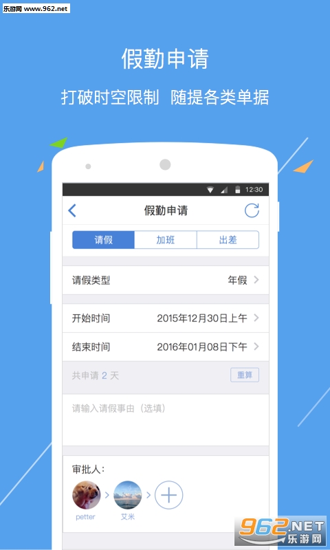 -移动申请,请假,出差,加班,补签申请可在移动端发起,只需轻轻一点即完成提交