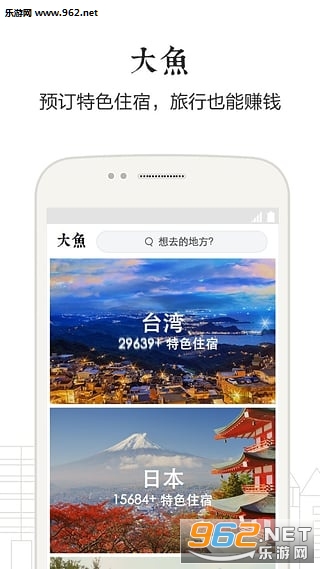 《大鱼》这是一款外出旅行必备App,帮助优先订到最优惠最棒的民宿旅馆,新一代境外住宿酒店在线预订平台,台湾民宿,日本旅馆,可优选各种类型,风景独好,温泉住宿等等,绝对符合你的要求。