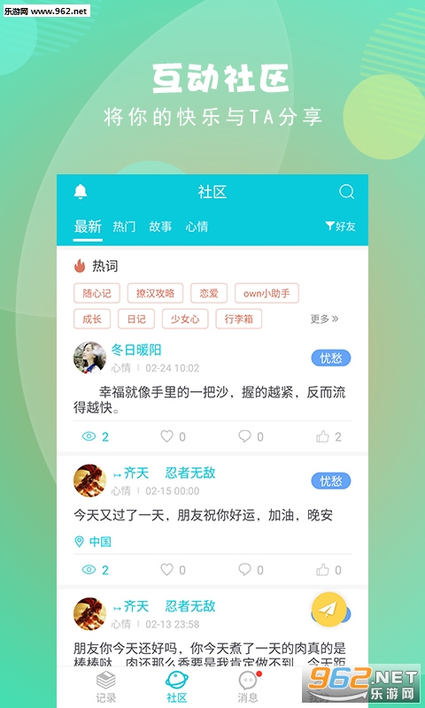 《Own日记无广告版》是一款心情日记,你可以在这里发布自己的小心情,或者分享到社区与好友互动,让你的世界不再孤单,新版上线,快来下载吧!