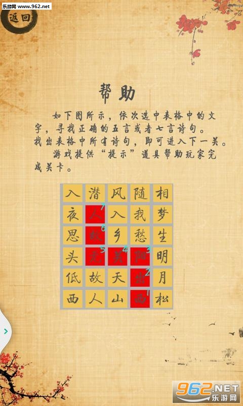 游戏里会有着各种各样的诗词,另外游戏里的操作也非常简单,“故人西辞黄鹤楼”,“随风潜入夜”……找出题目中所有的诗词。 1、本关中包含15-20个数量不等的诗句。 2、诗句有五言或七言。 3、找出所有的诗句,可解锁下一关。获得2个提示道具。
