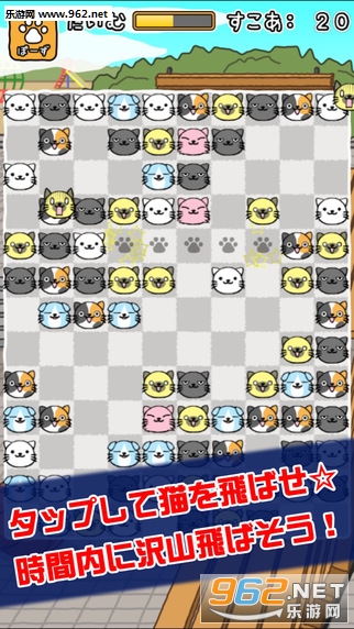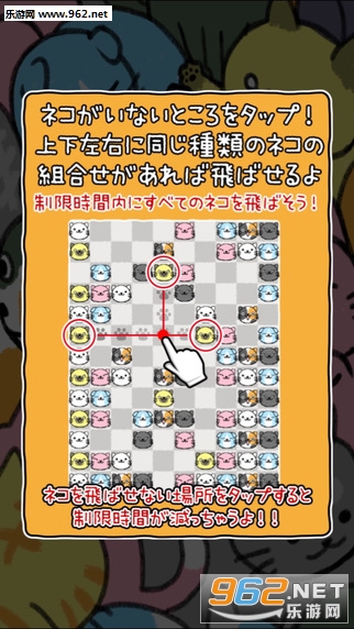 开始游戏之后画面中会出现一个由10x13的白/灰色小方格组成的大棋盘,棋盘上有各色猫咪头像分布。玩家要做的就是点击没有猫咪的空白小方格按下猫爪印,如果在以它为中心的十字路线上的猫咪里有颜色相同的,它们就会被送上天,也就是消除掉。