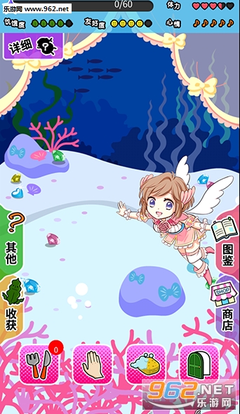 玩家刚上来有100个金币,然后买了个卵,戳一戳就变成一条超丑陋的水滴鱼(不知道水滴鱼为何物的可以自行问度娘)……然后给它喂食,抚摸它,清理海水中的污秽,这鱼就会升级,然后长成个超可爱的小萝莉,之后还会长成美丽的少女。
