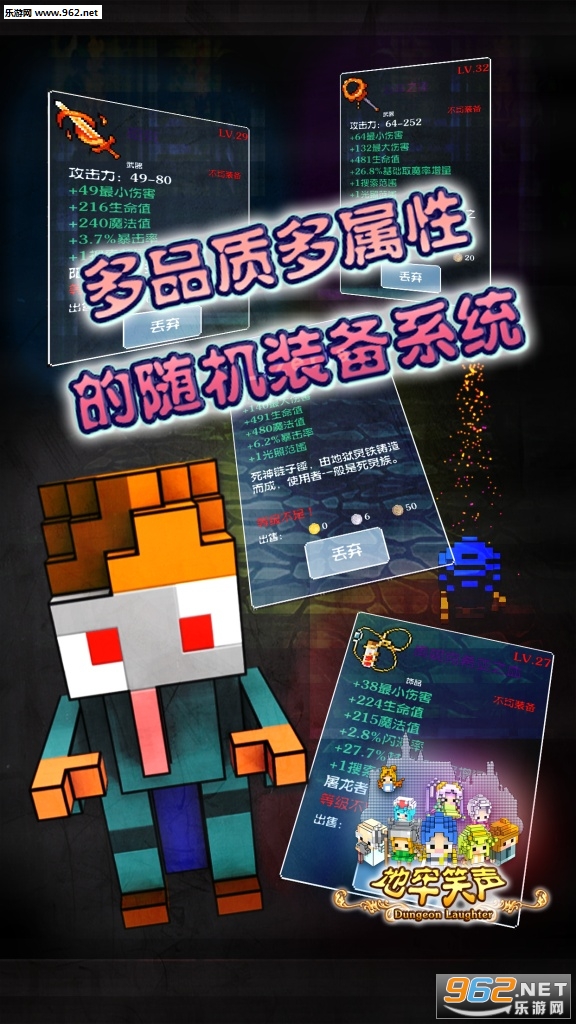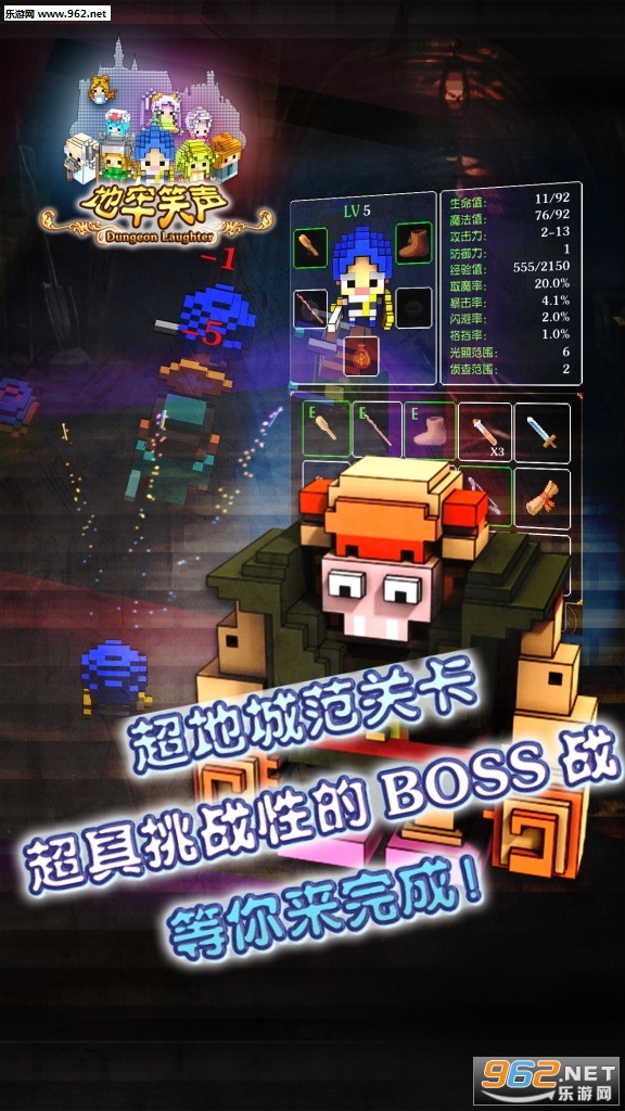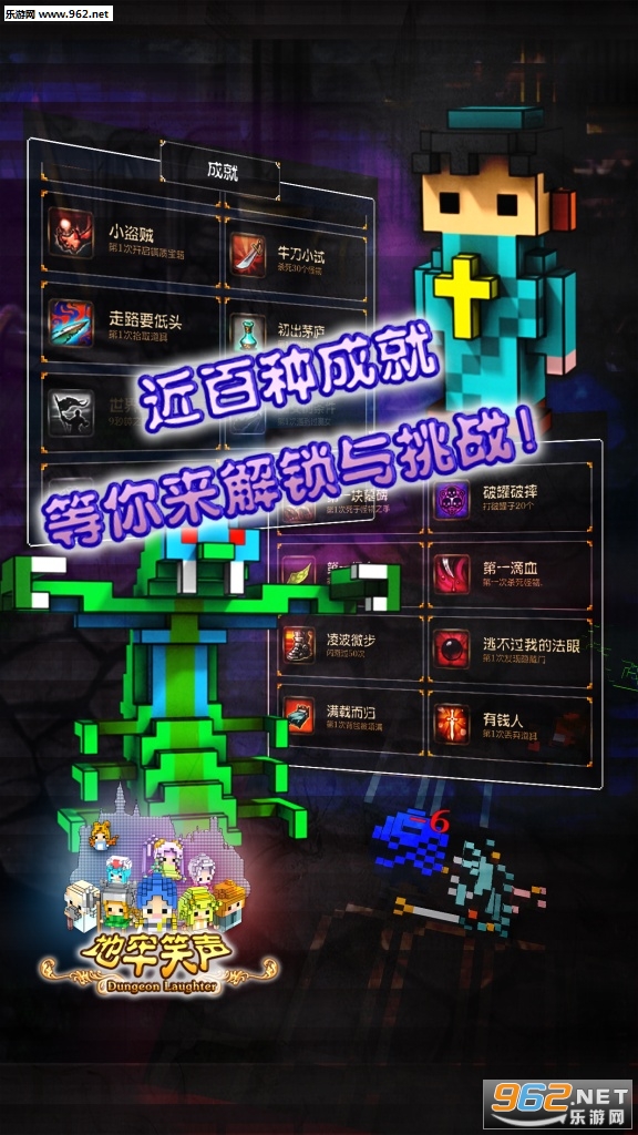 地牢笑声是一款以唤醒玩家熟悉记忆为目的的像素风RPG手游,游戏采用彩色像素画风,完全汉化的文本,其中有着众多熟悉的RPG桥段,比如翻草丛,踢箱子,随机属性的装备系统也会不断给你带来惊喜,还有丰富成就等你来拿!