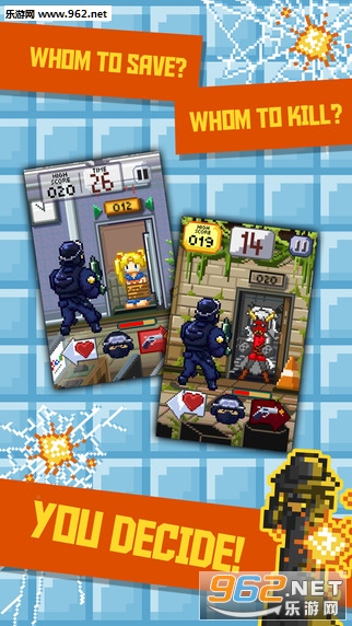游戏中玩家要完成的操作就两种——点击厕所门,看到谁呆在厕所里之后向左划屏给人质松绑,向右划屏消灭匪徒。与只要求左右划屏的“快速分类”玩法相比,本作虽然只多了一步开门,却让游戏的乐趣翻了好几倍,因为玩家会不断想知道下一扇门里到底会蹦出什么鬼。