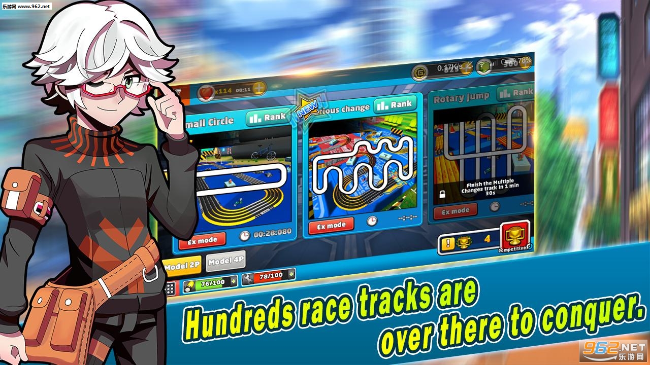 游戏以玩具四驱车为题材,超多款限量打印件等你来收集,玩家可以自己组装DIY超级赛车,速度奔驰,完美转弯,飞翔跳跃!再加上各种不同类型的轨道搭配具有挑战性的障碍让你挑战排名!