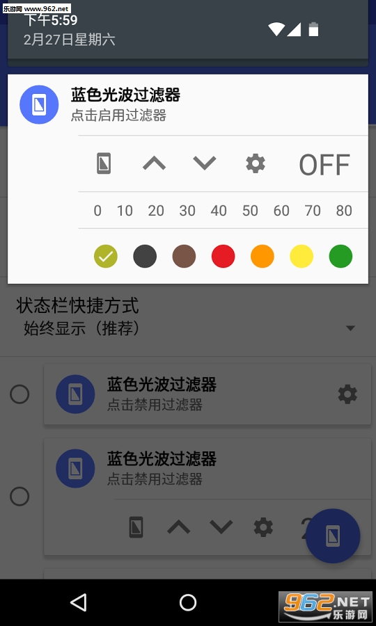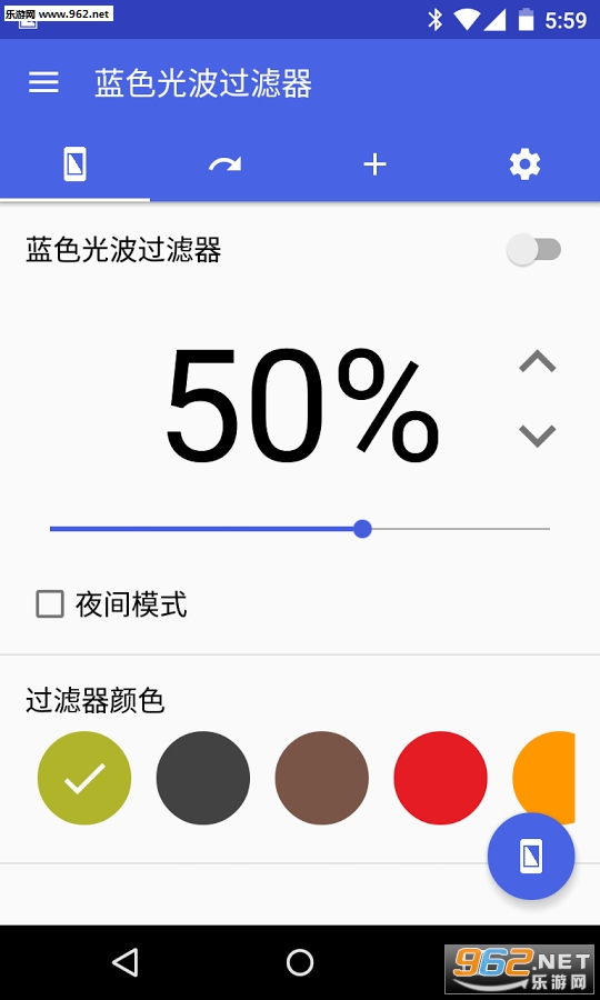 蓝色光波过滤器是一款屏蔽手机屏幕蓝色的软件,可以减少视觉疲劳,不过是否有用还有待玩家自行体验,这款软件可以随时变换手机屏的颜色组合,大家可以尽量调到舒适的颜色体验一下。