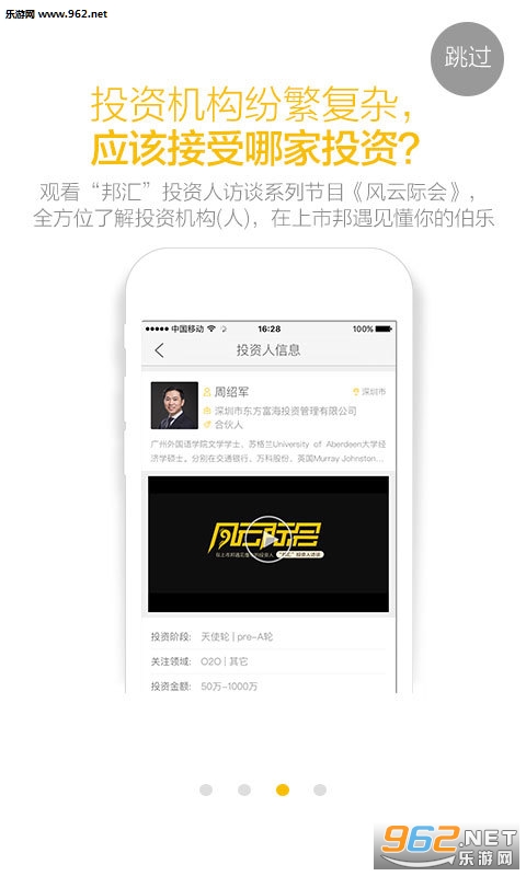 《上市邦手机版》是一款为创业人士打造的助攻神器,当你有好的项目,有价值的想法,却苦于没有资金来投入而陷入困境时,你需要这样一个平台,为你寻找专业的投资机构,给你带来资金,解决创业最大难题!