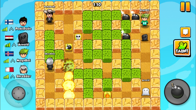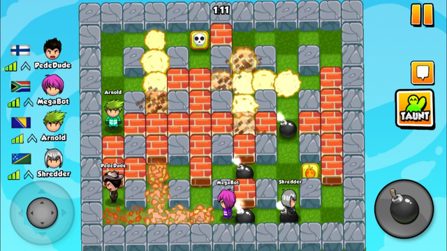 《炸弹人伙伴 Bomber Friends》是一款炸弹人游戏。除了传统的人机对战模式,还增加了在线对战模式,最多可以支持4个玩家在线对战。快邀请你的小伙伴们一起加入到这场炸弹人的游戏中。轰炸你的朋友,求得最后的生存,以赢得比赛,收集道具可以让你的炸弹威力更加强大。