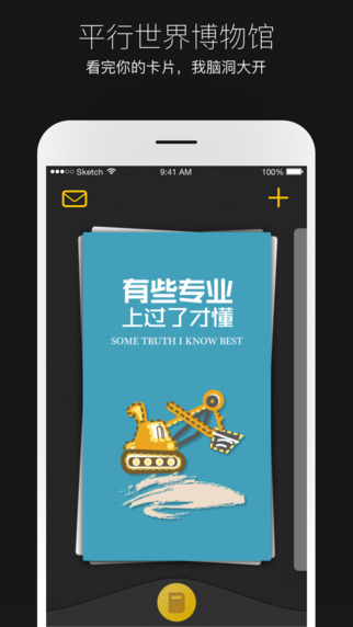 「平行世界」的交互与 UI 虽然还是稍显粗糙单调,但还是让我有种怦然心动的感觉。灰色纹理背景的世界下,三个按钮的位置正好构建一个等腰三角形撑起这个世界,卡片式的信息交互在这个世界里平滑的流动,卡片的图文排版很有格调让文字充满文艺的气质。