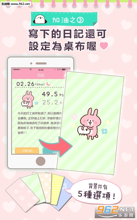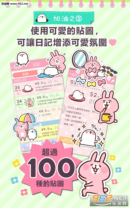 《徐缓地瘦身》是一款来自日本的可爱风格的减肥健身App,来自Line上留下的小兔子贴图的插画家打造,kanahei家的可爱减肥管理专家,画面超可爱,相对于其他App,这似乎更适合女生用户,用可爱的贴布写下你的健身日志吧!