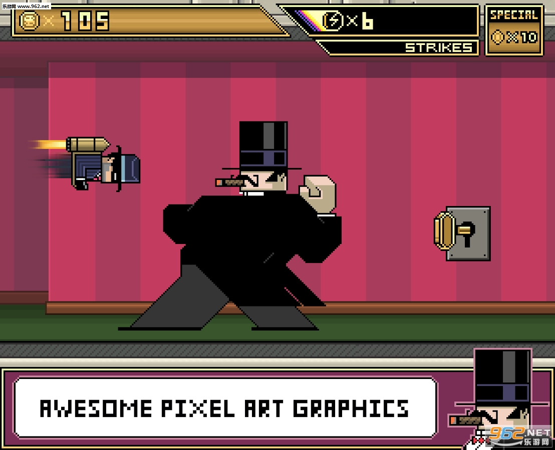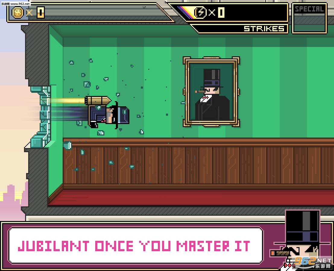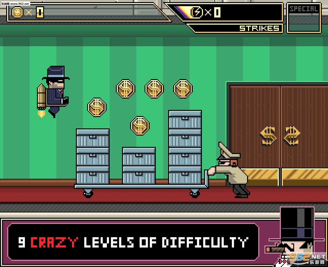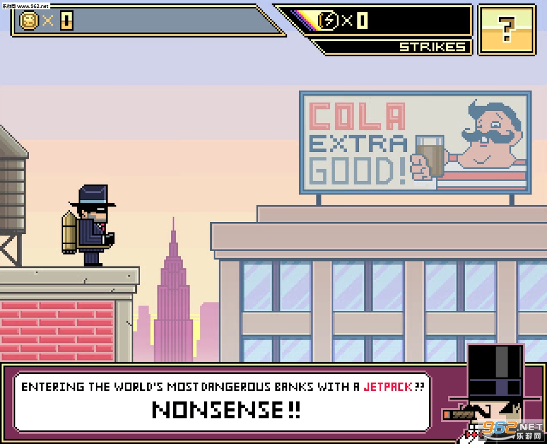 在这个挑战玩家的像素冒险游戏中,你将扮演一名名叫Billy的喷气飞行包复仇者,尝试入侵复古的摩天巨楼银行来归还被邪恶组织偷窃的金钱。游戏故事发生于复古8位风格的纽约,既有机械银行员又有少林护卫并使用飞龙踢和手里剑。