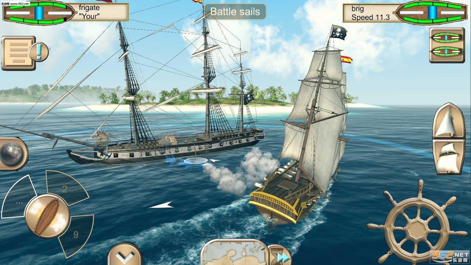 激烈的海战游戏,操作非常激爽流畅,虚拟方向盘和前进后退按钮控制战船方向与移动,炮射按钮控制攻击,相互配合才能击败敌人的船队。非常考验玩家操作能力。