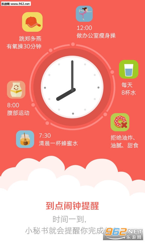 详细的每日任务 减肥小秘书会根据你选择的减肥方法为你规划好每一天的详细日程安排,生成每日任务,并会在相应的时间给你提醒,你不再需要纠结哪个减肥方法更好,不用计算复杂的热量摄入,只需根据App的提醒就能减肥成功!