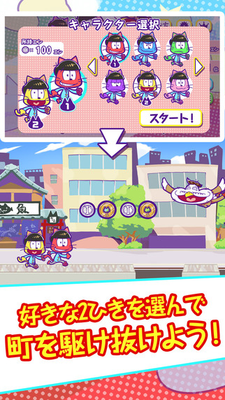 本作是一款跑酷游戏,玩家可以从 6 个猫咪化的阿松六胞胎中选择两个角色,然后进行跑酷,途中要躲避障碍收集硬币!收集获得的硬币还可以更换其他角色,还有同一个角色的不同服饰形态!还搭载了运程占卜功能,非常可爱哦!喜欢《阿松》的玩家们不要错过了。