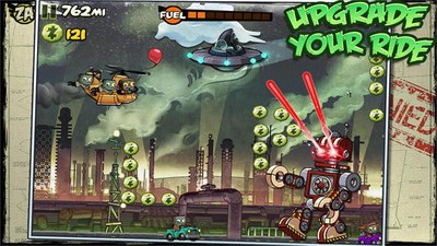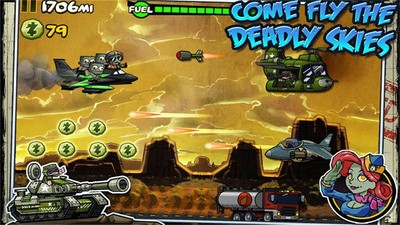 游戏可以选择五个不同的僵尸飞行员,他们有各自的能力,玩家可以升级他们,以及升级飞机、引擎和燃料。与美国防御军队展开对攻战,有的喷气式战斗机,轰炸机,攻击直升机以及坦克。非常考验你的雷电穿越和躲避攻击的能力。