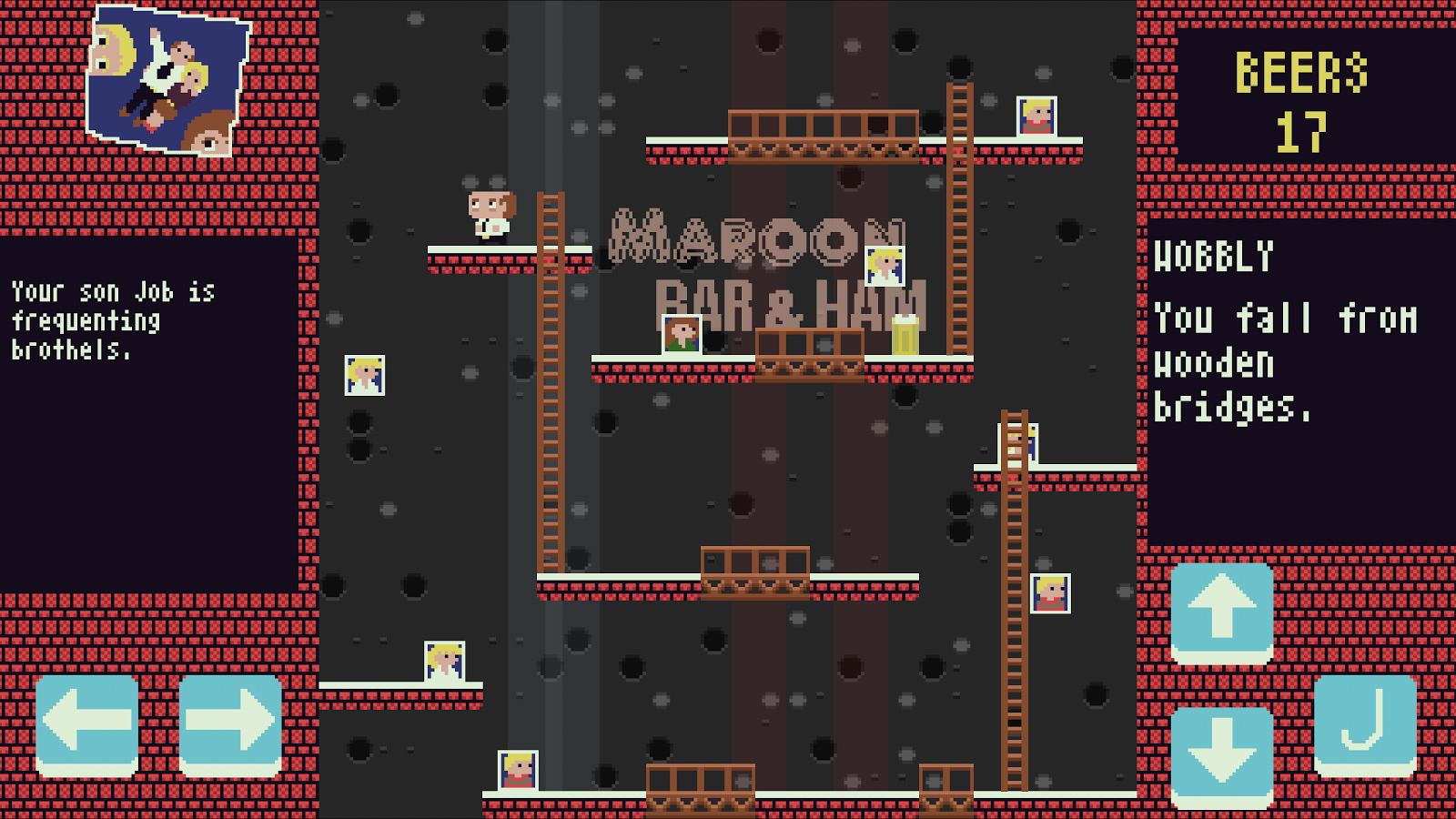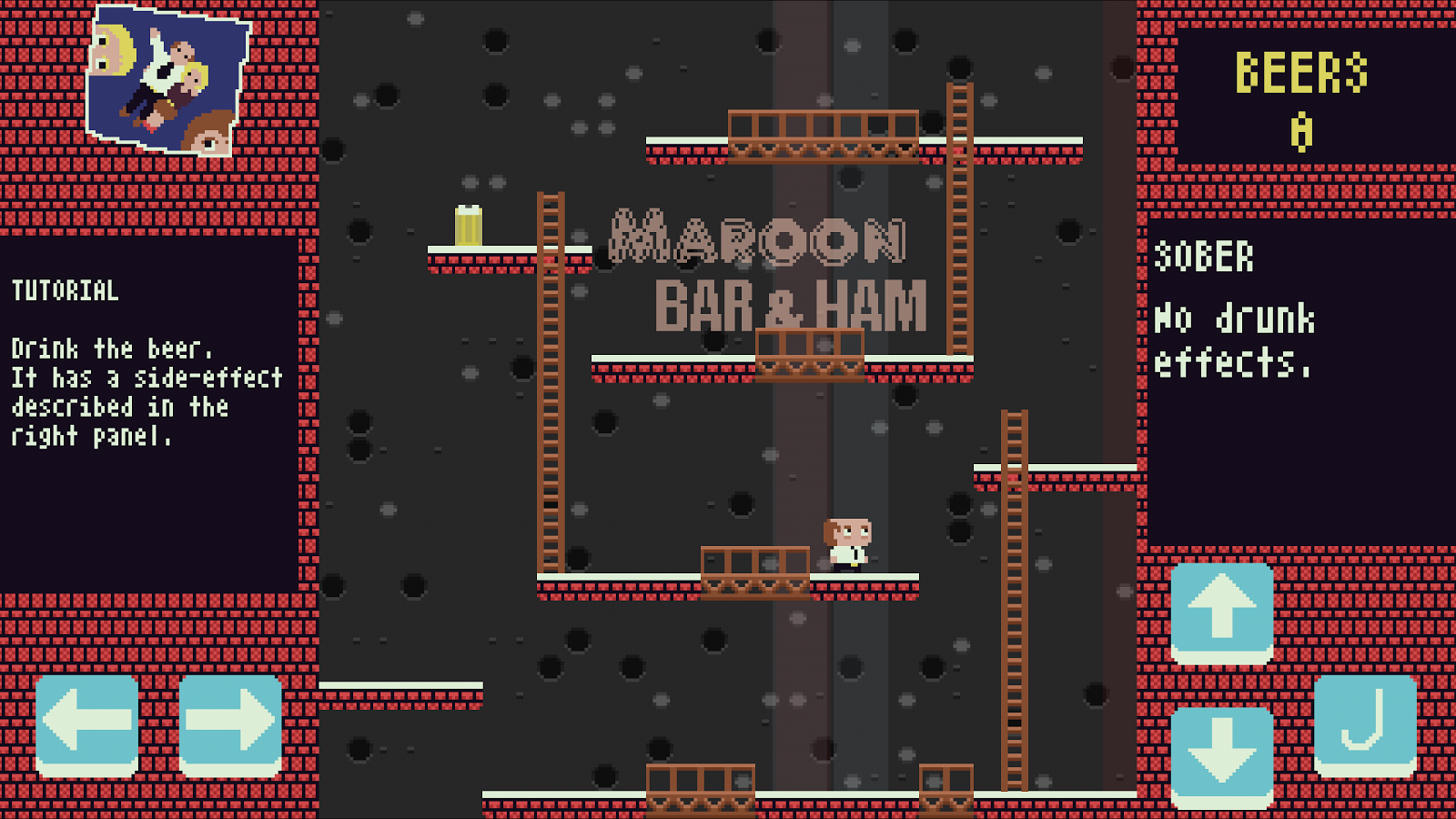 每次喝下的啤酒都会增加你的分数,并且加上不同的效果。有些啤酒会让你无法跳跃,而有些啤酒能让你摔下桥梁,还有啤酒能让你每过机瞄就呕吐一次,等等等等。