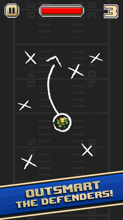 本作正是采用了这种进攻方式作为游戏玩法,让玩家一尝化身橄榄球员的滋味。在游戏里,玩家所扮演的是一名勇闯敌阵的球员,目的是将手上的橄榄球带进防守方的得分区,每成功闯过一关就能够获得一份。防守方自然不会让你安心完成任务,狂奔的过程中会出现许多如狼似虎的防守队员来拦截你的前进,玩家需要不断躲开他们的阻挠才能够得到更高分。