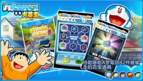 【功能介绍】 哆啦A梦道具大暴走官方版(Doraemon Gadget Rush)是一款紧张刺激的让动漫人物与你一起开启暴走模式的益智类休闲手机游戏,游戏中你讲协助哆啦A梦取回42件被偷走的百宝道具,赶紧来加入鱼好友一起在排行榜上大比拼吧!