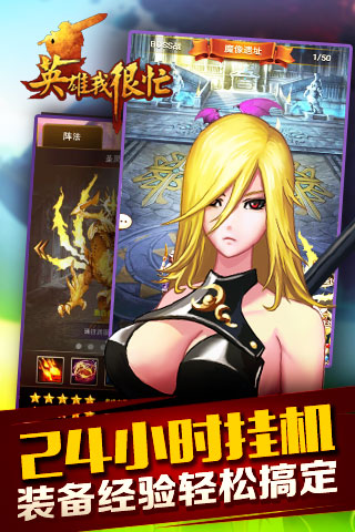 英雄我很忙是一款魔幻题材放置类RPG手游,玩家可通过挂机战斗的方式,来获得装备和经验。24小时不间断的战斗,就算离线也一样能有收获,让您轻松玩游戏,丰富的玩法简单又有趣。