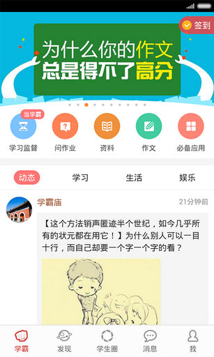 1. 有爱的【学生圈】和【小伙伴】板块,是同学们聊(chao)学(da)习(an)、晒(tan)生(lian)活(ai)的专属社区。