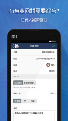 2、不管你是有专业问题需要找行家咨询,或是想结识靠谱的人成为你的事业伙伴,或者寻找合作资源,都可以来[会会]约人试试;