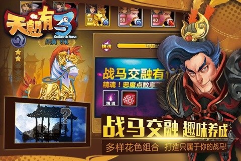 游戏中武将和马匹双线成长,多种培养模式,更有创新的鬼畜交融系统,风格贱囧恶搞。戏中将会有各种战马交融趣味养成,还有多样花色组合,快来加入打造只属于你的战马吧!