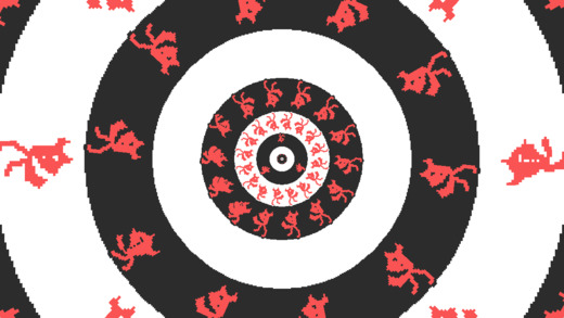 进入到内部之后,玩家可以看到在内部还有一个更小的圆在移动,当那个小球移动到某个与人比较近的距离以后,红色按钮就会亮起来,玩家按下红色按钮就能跳进下一个圆的外部。分别对应上图的上下两个部分,上半部分是黑色小人在圆的外侧,而下面部分则显示成白色小人进入到内侧。