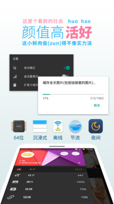 活好:缓存全天和快速缓存(适用于上厕所快憋不住的情形~),省流量模式(能节省80%以上的流量),夜间模式,清除缓存,分享...应有尽有,骗你小狗~