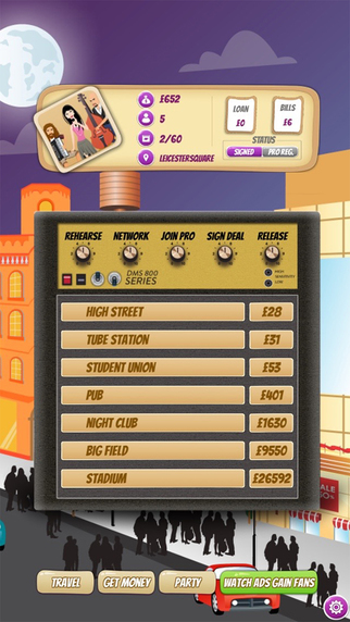 7种场地类型。解锁访问其他场地作为街头艺人在途中收集更多的球迷成为一个老板。高街,地铁站,学生会,酒吧,夜总会,大场和体育场等待。赚更多的钱作为场馆开放大门,你和你的粉丝。
