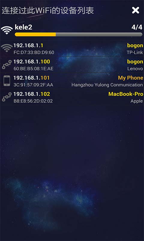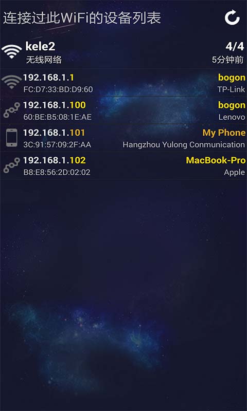 当你在看电视、电影或者打游戏的时候突然网也别卡,也许就是隔壁的小伙伴正在用你的网下载小电影,这款软件将会告别这一些。帮你找出蹭网的用户!