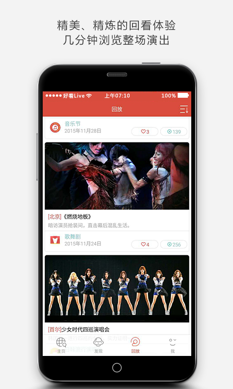 “好看Live”是首款专注于全球热门文化演出活动的体验式移动入口,在这里,除了发现精彩演出项目,还可以对演出现场进行实时在线围观及精彩浏览回看!不管你喜欢摇滚、话剧音乐剧、流行偶像演唱会、舞蹈、复古市集或者户外狂欢节……有了“好看Live”,即刻通往全球精彩演出现场! 感兴趣的演出总是错过?看视频直播又费时费钱?不知道身边和旅行目的地什么演出好看?想买演出票却因不知是否好看而犹豫不决?在“好看Live”,