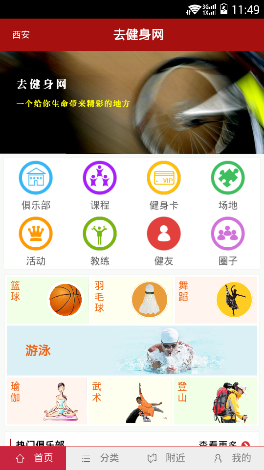 去健身是一款手机运动健身软件,去健身以健身活动作为主线,将爱好者、教练、陪练、健身俱乐部链接在一起,最后形成以城市为单位、以运动为基础,以运动场地为支撑的健身信息互动平台。