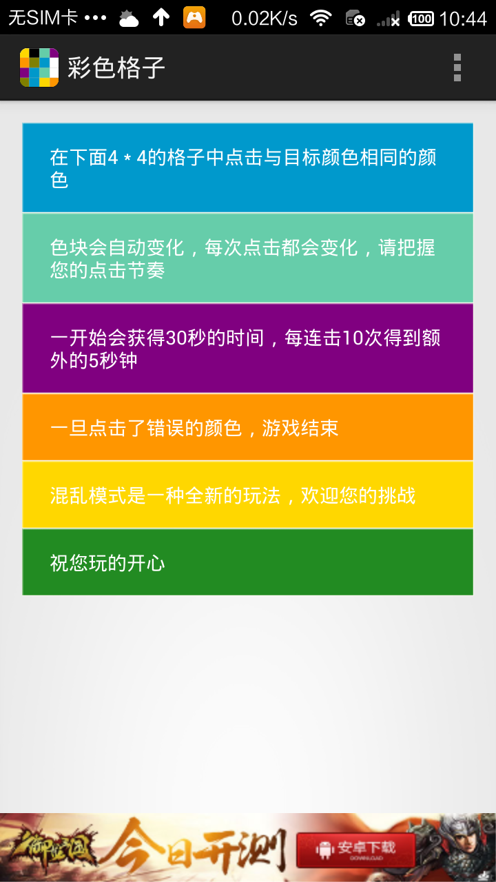 《彩色格子》是一款非常考验眼力的敏捷点击类休闲手游,游戏玩法非常简单,在屏幕下方的彩色格子中,找出并点击与目标色块一样的颜色,就可以继续下去,但是颜色变换非常快,玩家眼力要非常好游戏才会玩得6哦。