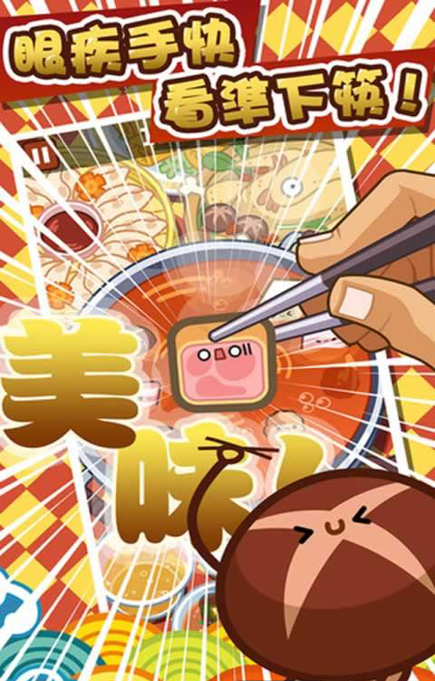 火锅达人是一款敏捷类超萌手游,又快过年啦,全家团圆吃火锅吧,玩家控制旋转的筷子,点击屏幕夹起各种呆萌的拟人化食物,要注意的是,夹起出现“Yum(美味)”的食物能得到更高分数,但如果夹失了就会失去一个火锅,当屏幕下方的三个火锅机会都被耗光后游戏就随之结束。