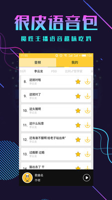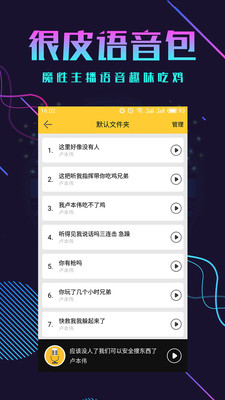 很皮语音包可以让你在玩吃鸡的过程中使用各种主播,影视人物的声音进行游戏,实时更新网络上流行的各种有趣的声音!各大主播任您选!