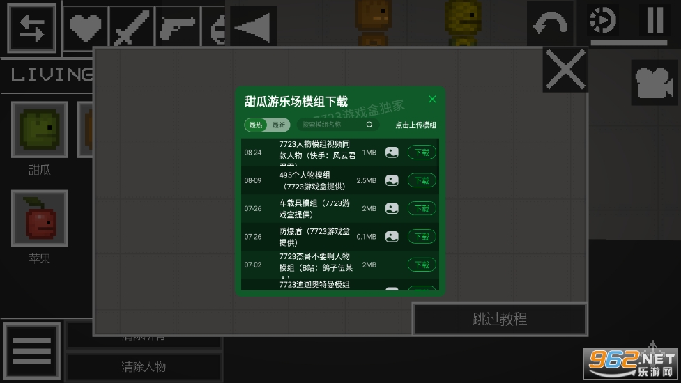 《甜瓜游乐场》是一款全新的模拟沙盒游戏,类似于《火柴人游乐场》,没有任何的规则和任务,里面拥有丰富的物品,道具,玩家可以在不同的地图中,使用锤子,斧头,刀剑等武器,以及不同的材料来建造车辆,堆放西瓜,或者模拟一些其他的有趣场景!