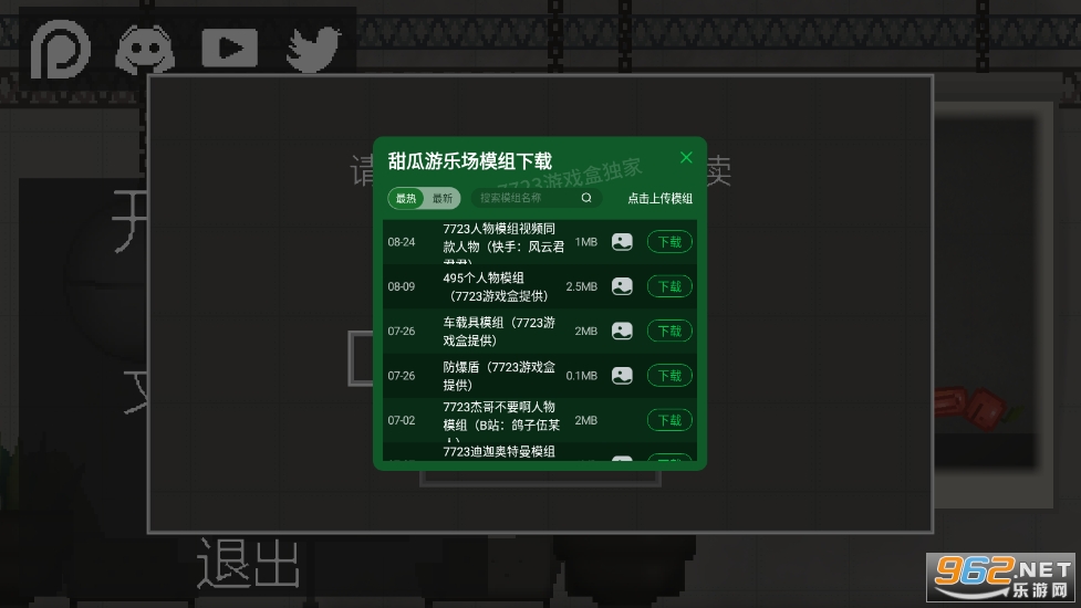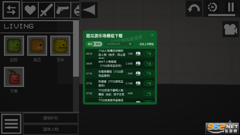 《甜瓜游乐场》是一款像素风沙盒模拟游戏,此版本由7723游戏盒为大家带来,除了已经汉化,去广告之外,还自带模组,有坦克音速炮弹模组,虎式坦克蓝图模组,婴儿模组,二西莫夫模组几个模组,玩家可以自由的使用枪,刀,矛,斧头等武器和冷兵器,炸药,铠甲,汽车等载具,在游戏里面推动人物和物品,模拟各种动作和剧情!