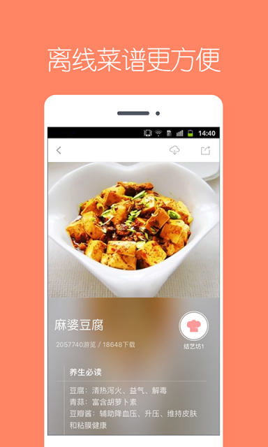 《美食菜谱大全app》是一款为广大朋友打造的生活服务软件,软件中收录了各地方,各种特色佳肴的制作方法,让你瞬间成为一位大厨。软件中分类明确,有着家常菜、川菜、烘焙等系列,每种菜肴的下面不仅注释着制作反复,还把他的养生作用等列了出来,非常实用。