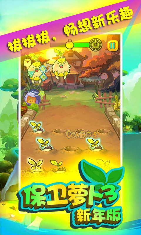 《保卫萝卜3新年版》是一款Q版创意类趣味游戏,拥有唯美的卡通剧情和画面,游戏画面可爱逗人,玩法超简单超有趣,速度超快的狂暴模式还真的快让我抓狂了,根本停不下来。让我们一起来收货疯狂的型男小萝卜吧,让轻松的生活充满可爱的乐趣,千奇百怪的造型萝卜乱入,萌萌可爱亮瞎你的眼球,么么哒的音效引爆你疯狂拔萝卜的冲动。