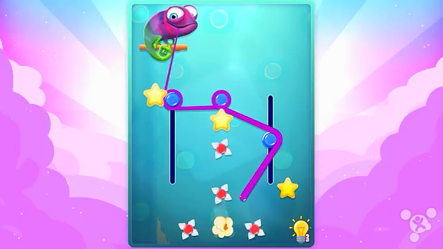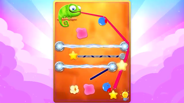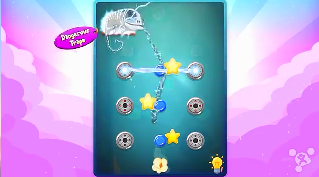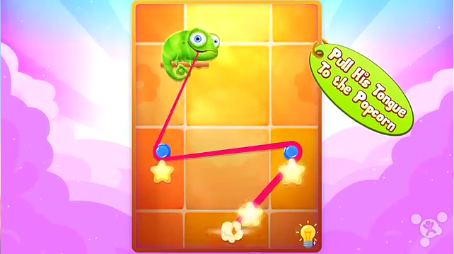 游戏的玩法十分简单,在有着不同陷阱的每一个关卡中,玩家需利用拖动屏幕的方式拉动小蜥蜴的舌头,通过巧妙的绕过障碍或使用有利的道具等,将爆米花顺利送到它的口中即可过关。如玩家无法通过某个关卡时,也能点击右下角有限次数的灯泡提示,来获得一次通关的提示。