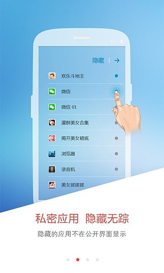 &65279;《关云藏手机防查大师app》是一款隐私保护类软件,可以帮助用户隐藏起手机中一切需要隐藏的内容,不管是谁查看你的手机,都不会露馅哦!不过用户自己要设置好密码,就像分身了一样,一个正派君子,一个猥琐小人,藏起猥琐小人的一面,展现你的浩然正气吧!
